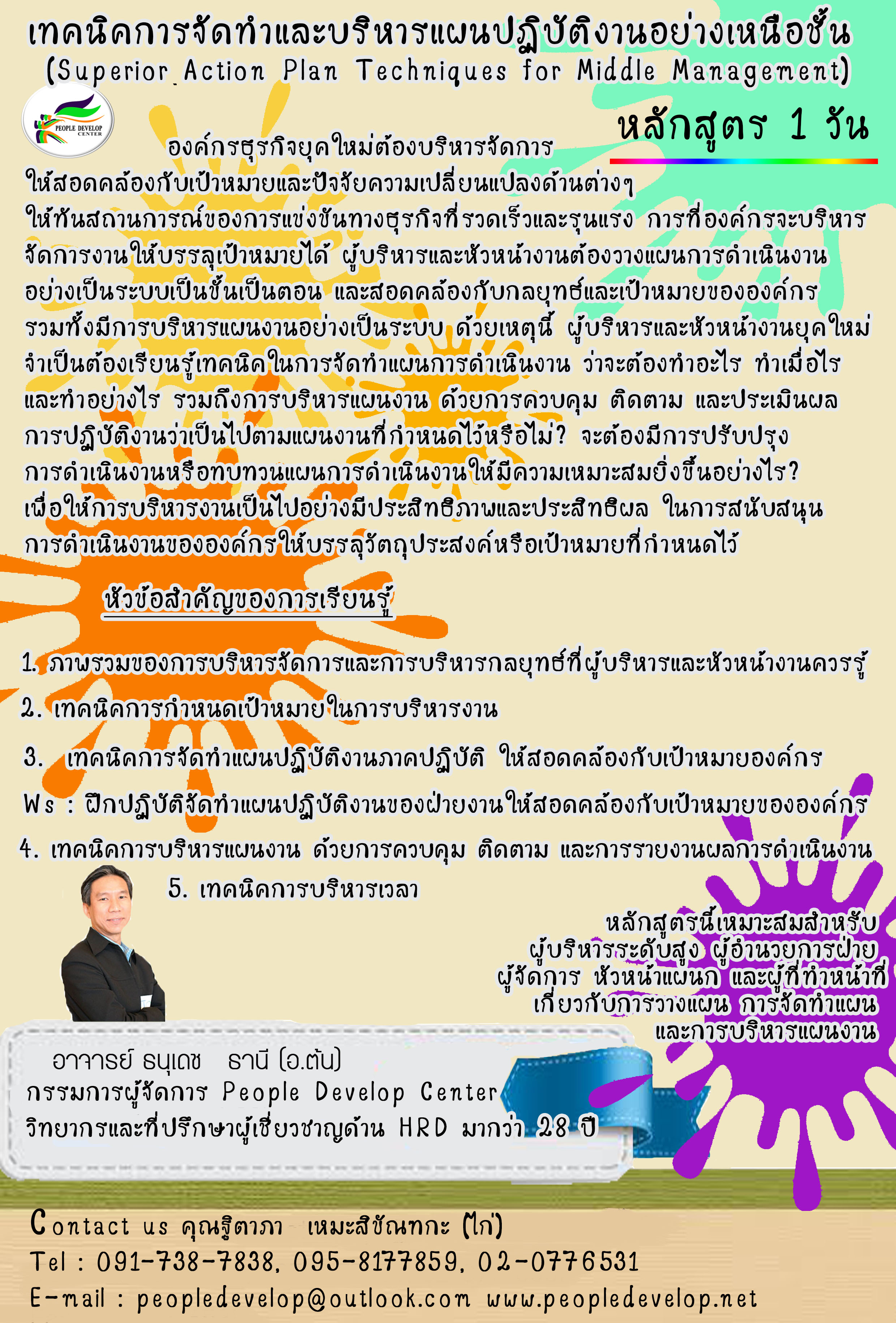 หลักสูตรฝึกอบรมนี้สถาบัน ฯ ได้ออกแบบและพัฒนาจากประสบการณ์ของวิทยากรในการจัดทำและบริหารแผนการปฏิบัติงาน ที่จะช่วยให้ผู้จัดการและหัวหน้าแผนกองค์กรของท่านสามารถจัดทำและบริหารแผนปฏิบัติงานอย่างเหนือชั้น