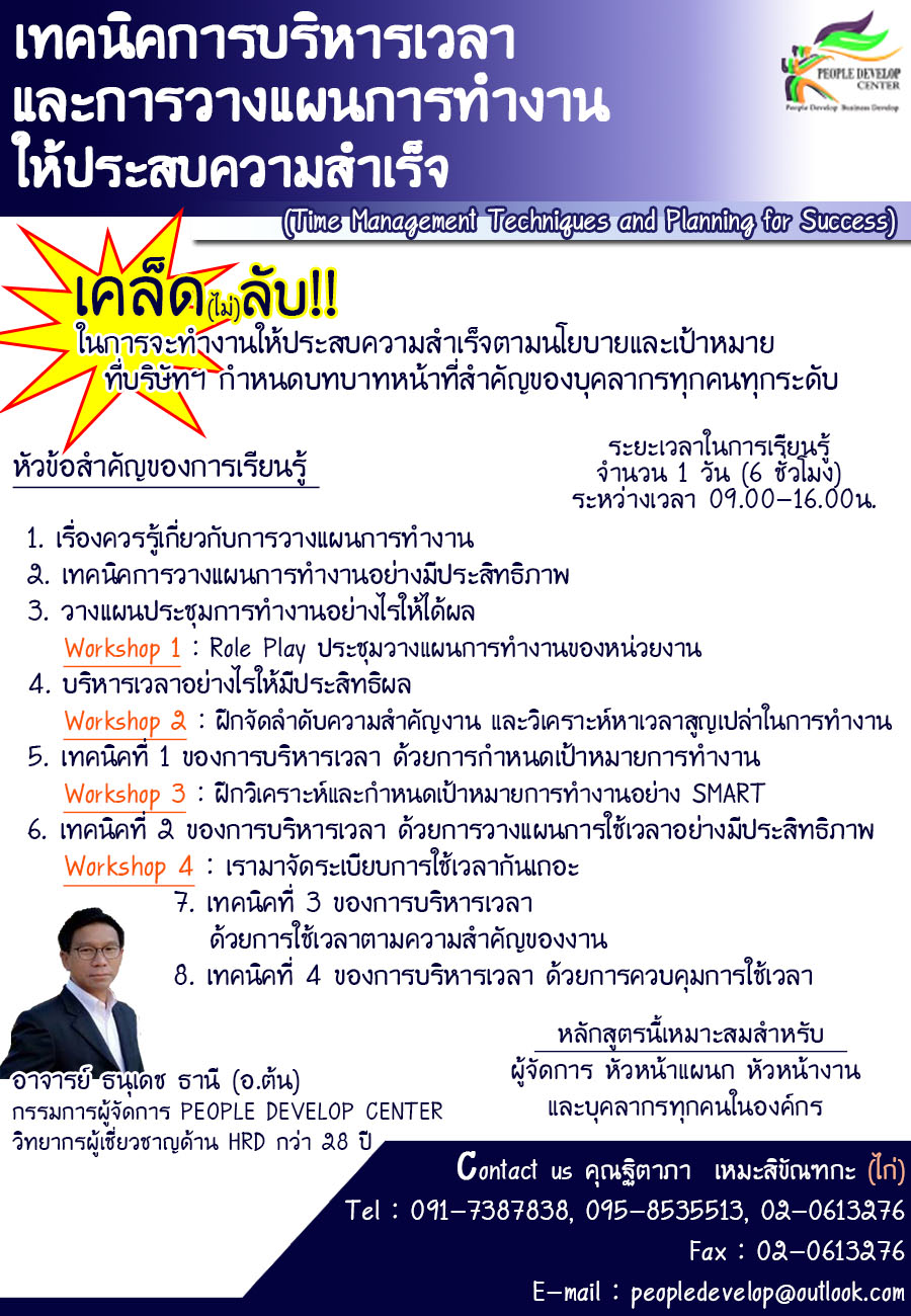 ถ้ายัง...ของเชิญท่านพบกับหลักสูตรฝึกอบรมที่สถาบันฯ ได้ออกแบบและพัฒนาขึ้น จากประสบการณ์ชีวิตในการบริหารเวลาและการวางแผนการทำงานของวิทยากร (ที่เติบโตจากคนเคยที่อาศัยข้าววัดกินมา 10 กว่าปี เคยทำงานก่อสร้างมา 2 ปี       จนก้าวขึ้นมาเป็นผู้จัดการฝ่ายทรัพยากรบุคคลองค์กรขนาด 5,500 คน จนกระทั่งก้าวขึ้นมาเป็นเจ้าของกิจการสถาบันฝึกอบรมชั้นนำในปัจจุบัน) ที่จะช่วยให้บุคลากรในองค์การของท่านได้เรียนรู้และจุดประกายแนวความคิด “การบริหารเวลา และการวางแผนการทำงานให้คุ้มค่า และเกิดประโยชน์สูงสุด” เพื่อความสำเร็จในชีวิตและหน้าที่การงานของตนเอง และนำมา  ซึ่งความสำเร็จตามเป้าหมายขององค์กร